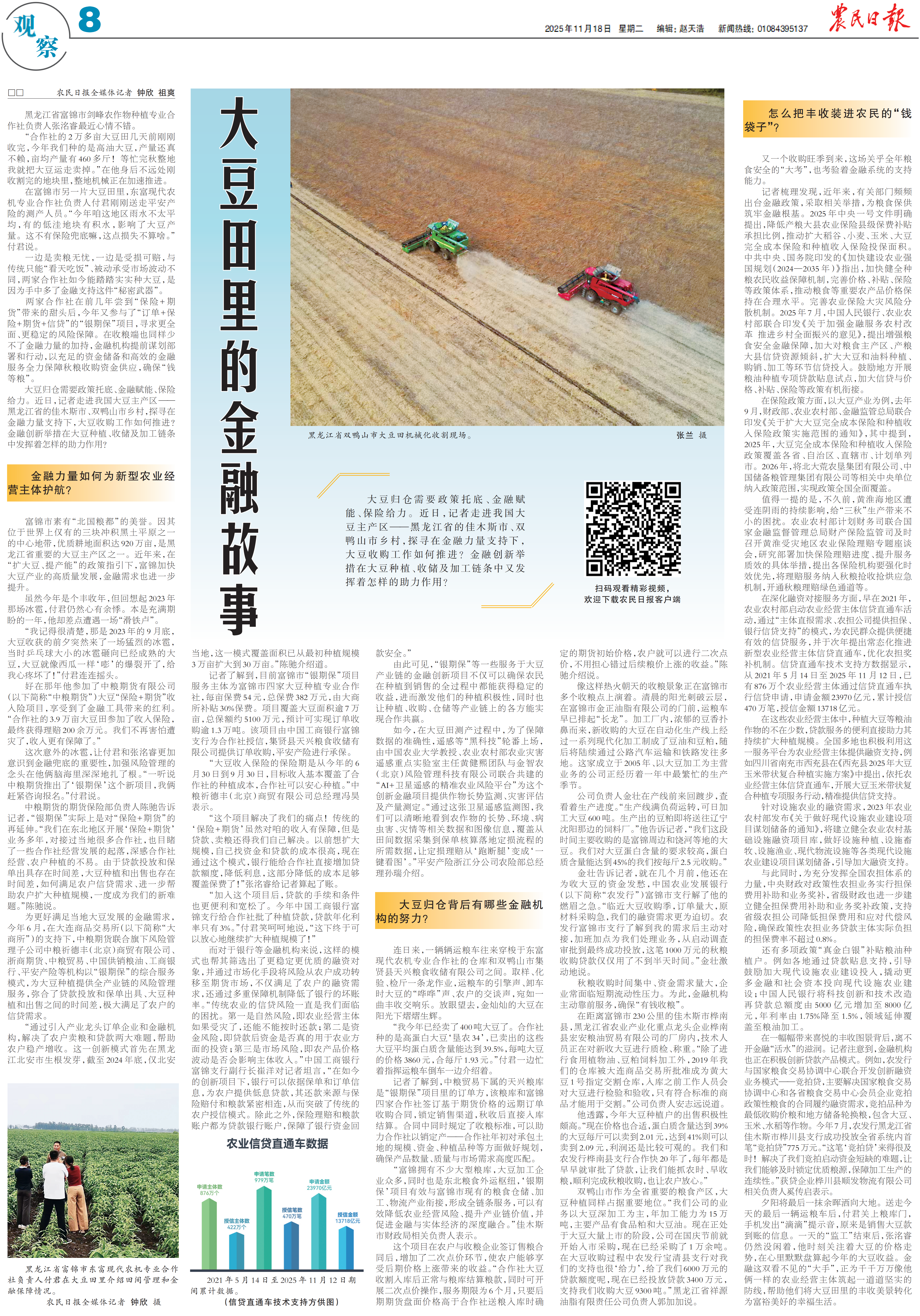 夕阳将最后一抹余晖洒向大地。送走今天的最后一辆运粮车后,付君关上粮库门,手机发出“滴滴”提示音,原来是销售大豆款到账的信息。一天的“监工”结束后,张洺睿仍然没闲着,他时刻关注着大豆的价格走势,在心里默默盘算起今年的大豆收益。金融这双看不见的“大手”,正为千千万万像他俩一样的农业经营主体筑起一道道坚实的防线,帮助他们将大豆田里的丰收美景转化为富裕美好的幸福生活。